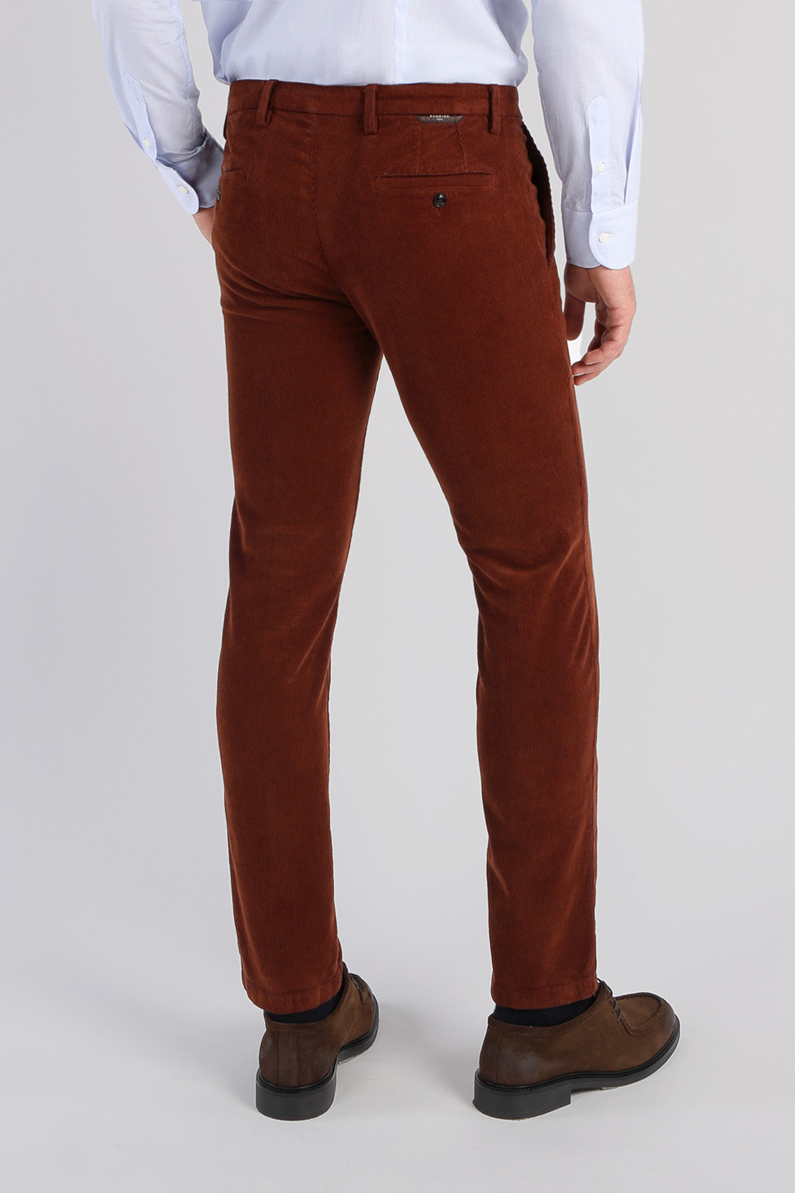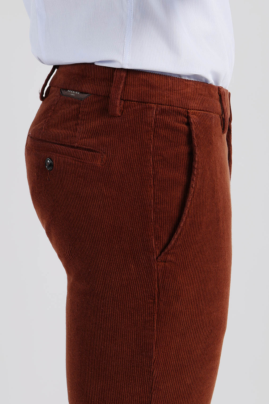 Il pantalone chino in velluto mille righe Rodrigo è un capo classico e confortevole, ideale per la stagione fredda. unisce il calore e la texture raffinata del velluto a coste sottile alla praticità del tessuto stretch.