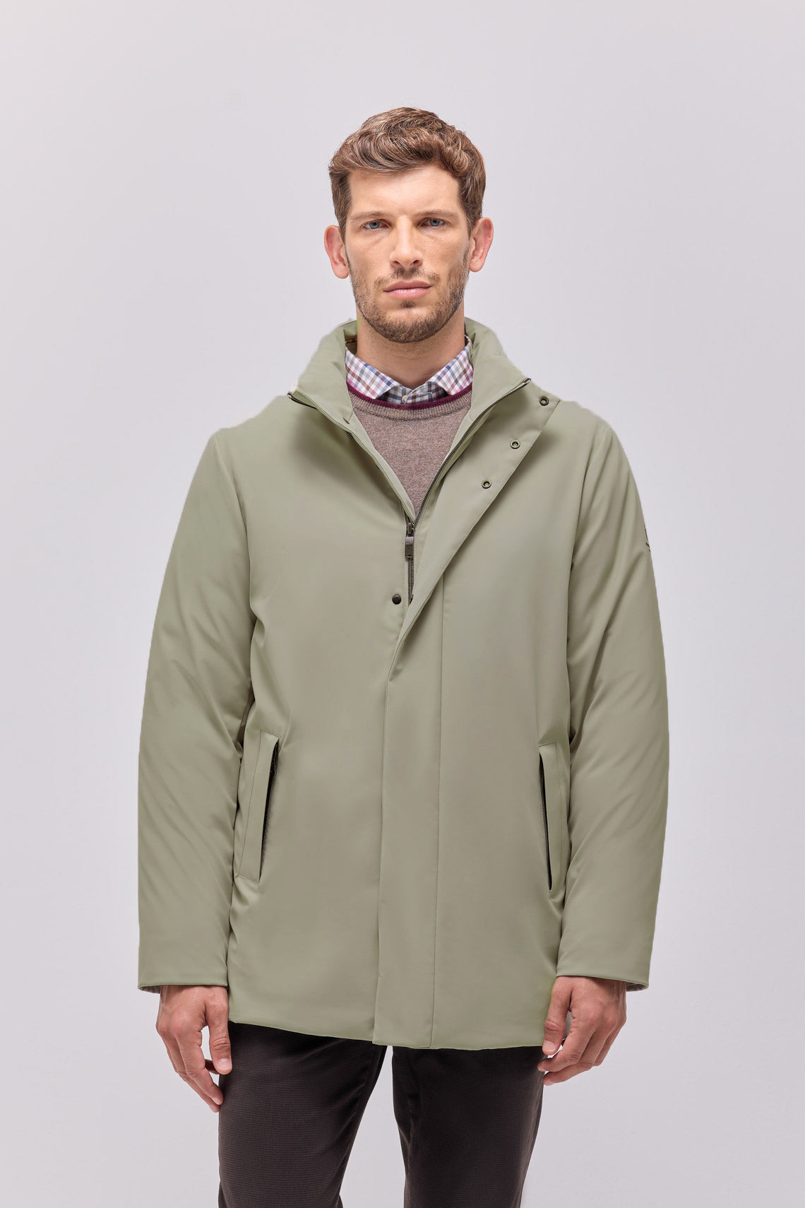 Realizzato in nylon stretch ad alta performance, offre un'eccezionale elasticità e resistenza agli elementi, mantenendo la forma nel tempo. Il collo in piedi aggiunge un tocco di eleganza minimalista e assicura una protezione superiore dal vento. Perfetto per la vestibilità regular fit.