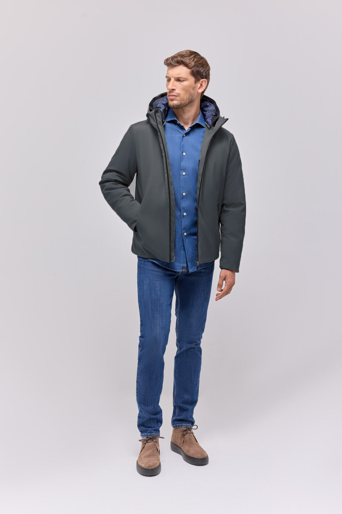 Parka corto imbottito in techno stretch con cappuccio staccabile